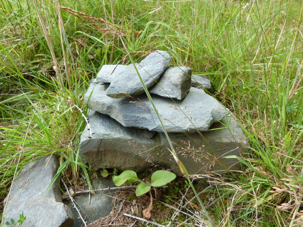 Retrace your steps and just past a track that goes off to the left you will see a small cairn and a path that goes deep into the forest.